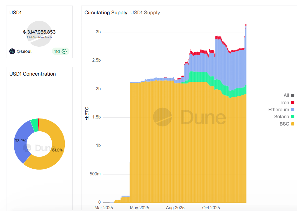 Alrededor del 61% de USD1 se encuentra en la BNB , una disminución con respecto al 94% inicial. La oferta de USD1 con mayor crecimiento se encuentra en Ethereum , con fuertes entradas a Solana .