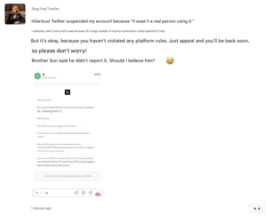 A screenshot shared by crypto investor Yijin Li, appears to show Ten Ten, real name Zeng Ying, sharing an email from X regarding the suspension.