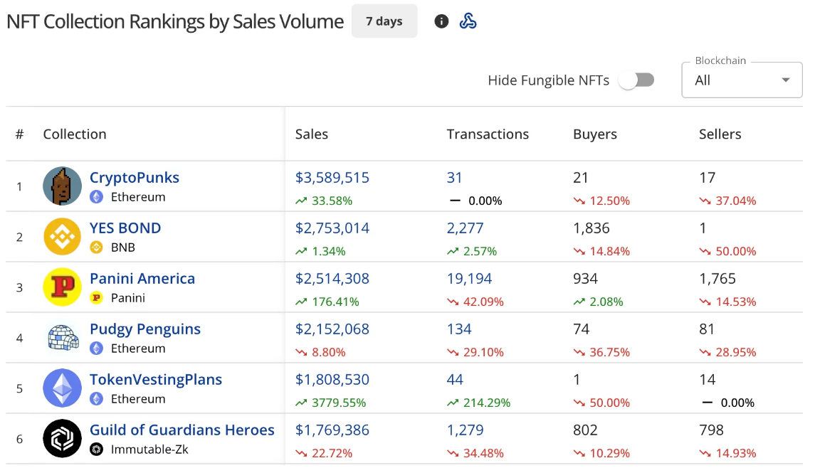 Panini America на блокчейне Panini взлетела на третье место с $2,51 млн, прибавив 176,41%. В коллекции было 19,194 транзакции с участием 934 покупателей и 1765 продавцов.